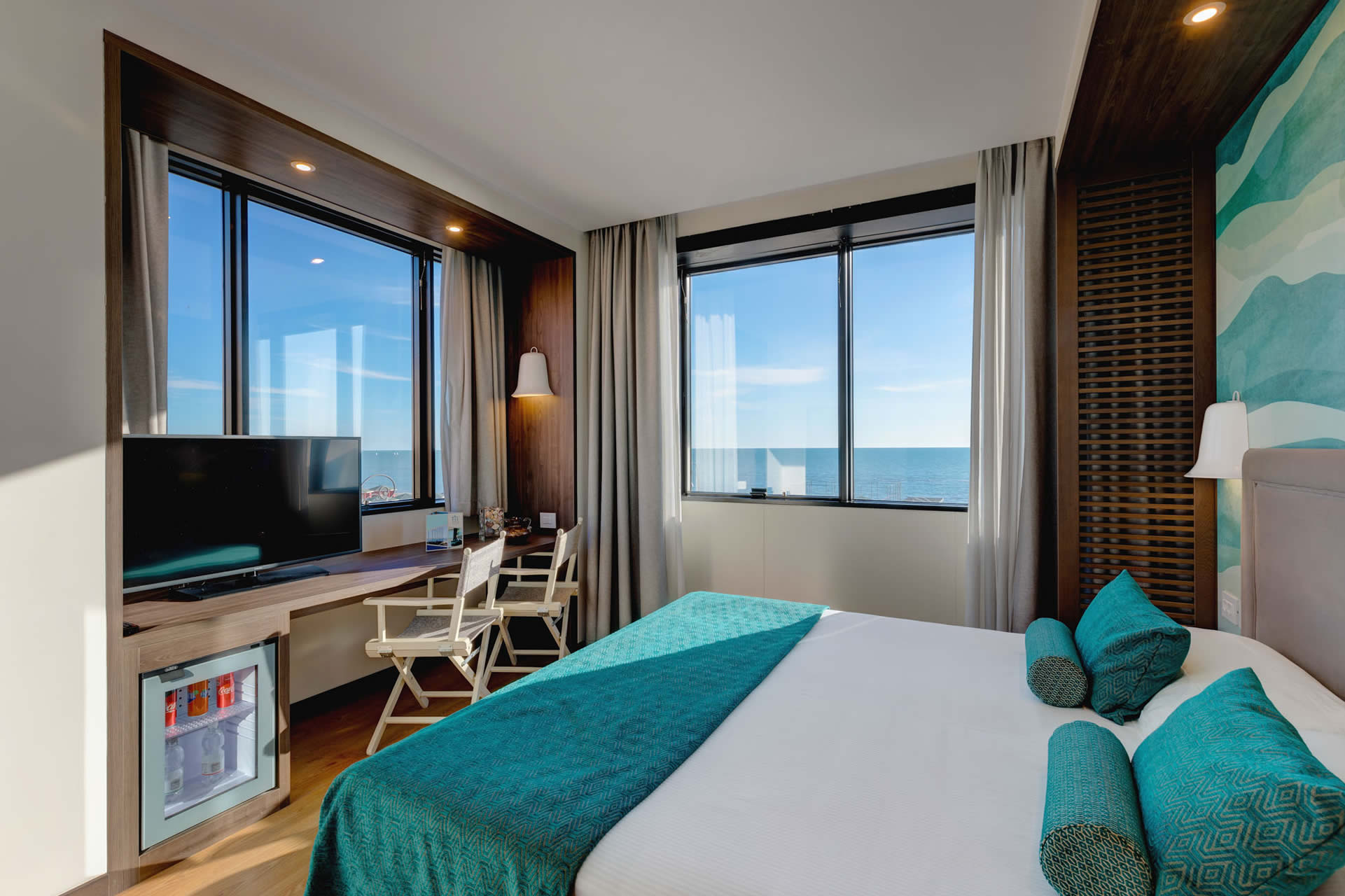 Le 31 camere dell'hotel, ampie e molto luminose, sono caratterizzate da un design elegante e mobili in legno. Dispongono tutte di grandi vetrate che permettono di godere appieno della vista del mare a pochi passi.